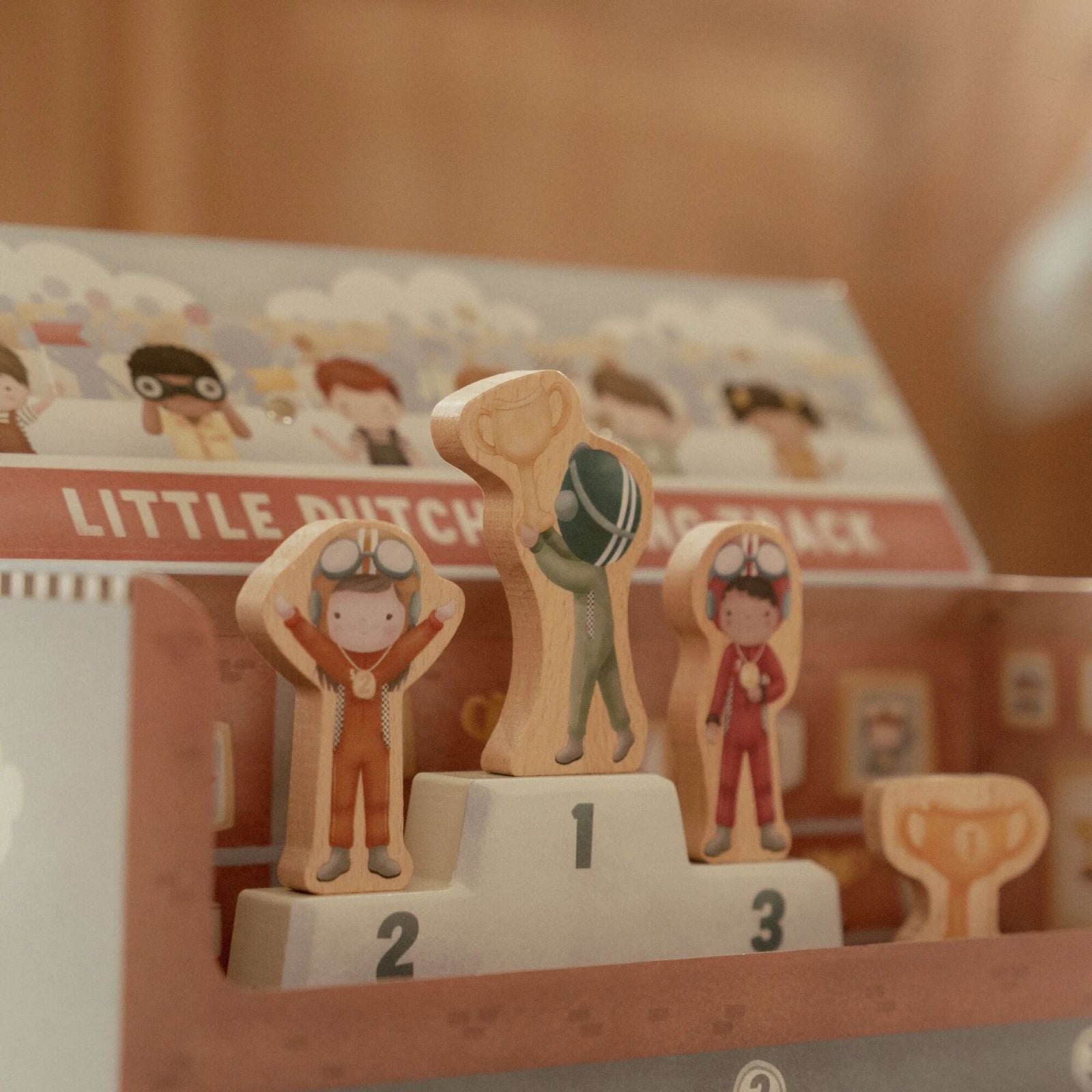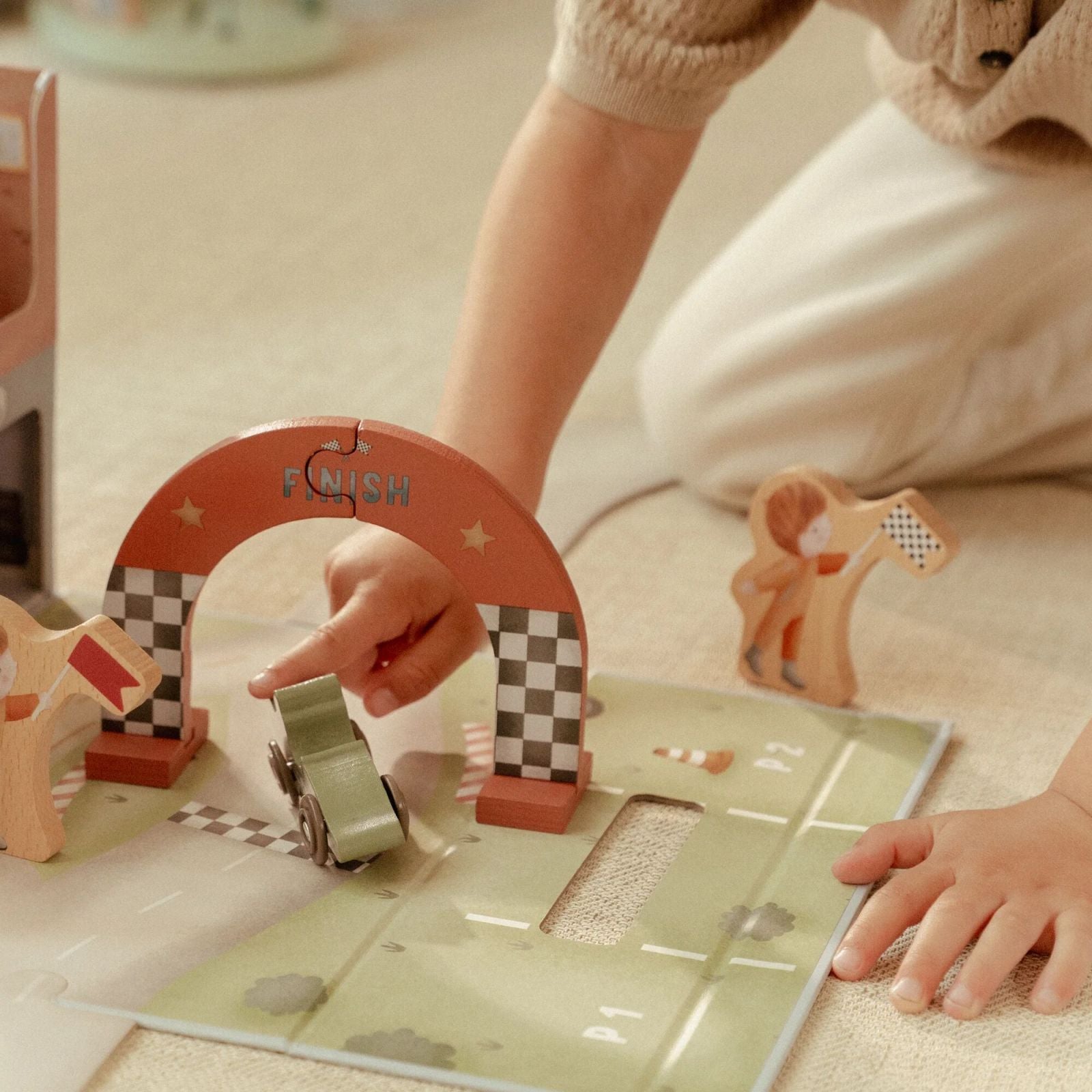 Play case with race track di Little Dutch è una valigetta gioco che si trasforma in una pista in cartone per macchinine. Il gioco include 3 macchine da corsa in legno, 1 trofeo, 5 personaggi, 1 traguardo, 1 podio, 2 segnali stradali e 1 semaforo. Apri la valigetta, costruisci la pista e diamo il via a infinite sfide, gare e gran premi. 3 personaggi "piloti" e 2 personaggi "sbandieratori" inclusi nel set per rendere il gioco ancor più verosimile. I bambini ameranno inventarsi nuove avventure e gare per un divertimento senza fine. Il gioco è facilmente afferrabile dalle manine dei più piccoli, grazie al design aperto, stimola così coordinazione e fantasia. Ideale come regalo per bambini, è il gioco portatile perfetto per viaggi e momenti di svago.